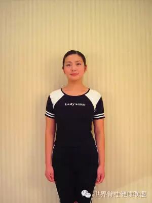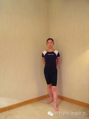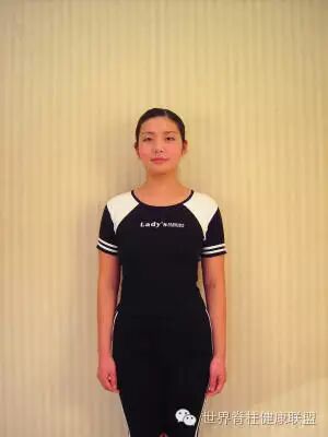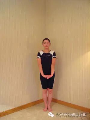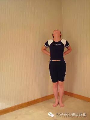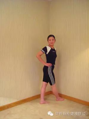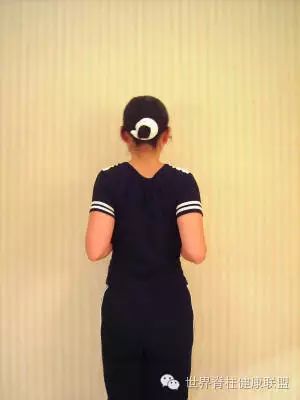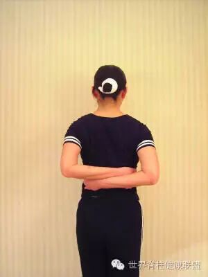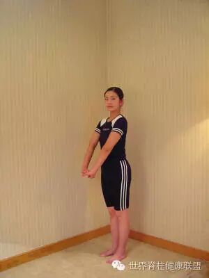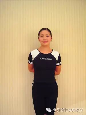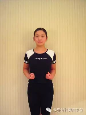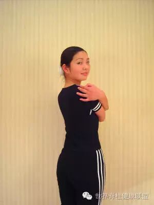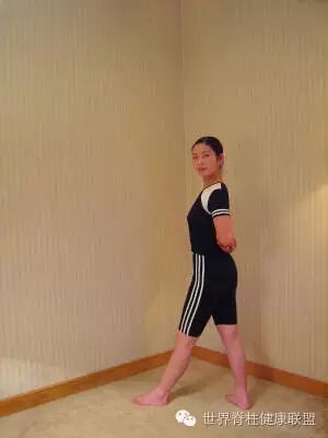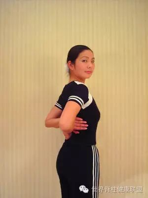 体操方式:正立,双手转向背,掌心按压腰背部,转动胸廓,左右转动各8×4次。