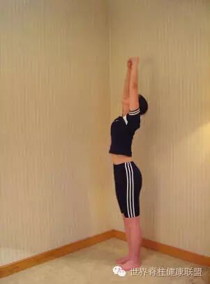 体操方式:正立,稍息步态,两目平视,双足站稳,腰背挺直,收腹、抬头、双手五指交叉,上举头顶,并向上伸展,同时感出“呼”声,双手放下,再上举,反复8×4次。