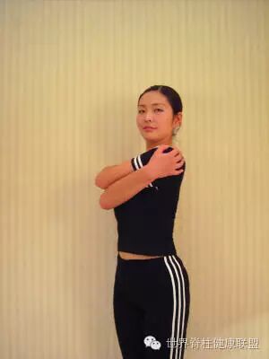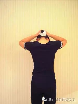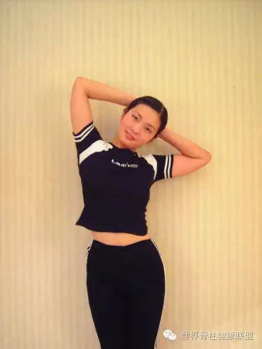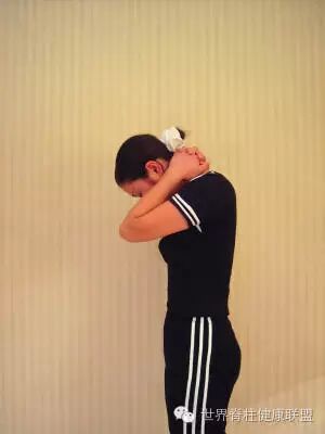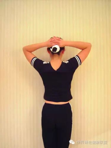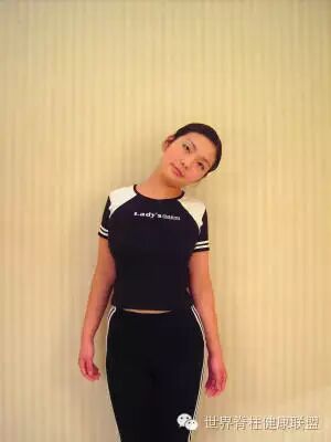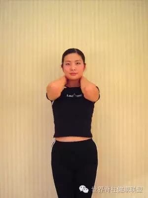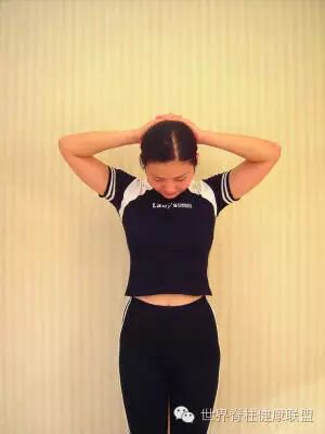体操方式:正位、两目平视,双手屈肘,两手掌合拢于脑后,然后将头颈往一侧屈,并稍加压力,左右侧屈各8×4次。
