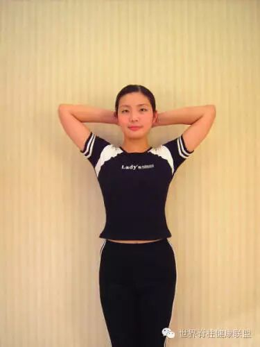 体操方式:二目平视,双手屈肘,双掌合拢后脑。