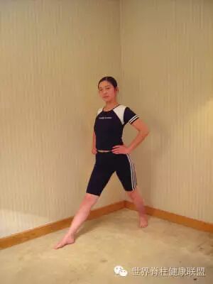 体操方式:站立,双手叉腰,右下肢前跨,身体前倾,并屈膝(前弓),左下肢后伸直(后箭)后退回伸右膝,身体后倾,一前一后反复8×4次。