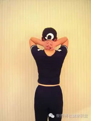 体操方式:直立稍仰头,双手合拢颈后,用腕关节拿捏颈后肌肉,并提拔8×4次。