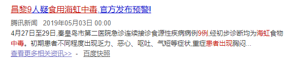 2019年4月27日至29日,河北省昌黎县也陆续出现9例食用海虹中毒患者。海虹中毒后,初期症状为口唇、手脚麻木,后期伴有恶心呕吐、头晕等症状,重症患者呼吸困难、四肢无力、伴有昏迷。