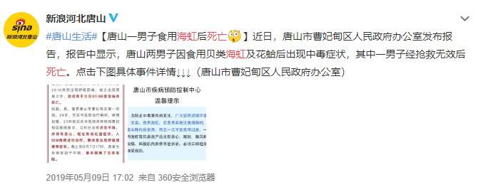 2019年5月7日,唐山一男子食用海虹后死亡。唐山市曹妃甸区人民政府办公室发布报告,报告中显示,唐山两男子因食用贝类海虹及花蛤后出现中毒症状,其中一男子经抢救无效后死亡。