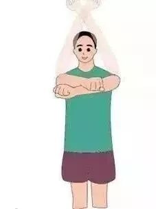 招式二:双手在身体前方交叉握拳,缓慢上举过头顶。(达到极限后坚持6秒)