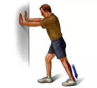 找一面墙,不疼的腿在前,足跟痛的腿在后,前腿弓,后腿绷,然后双手推墙。在这个过程中要注意,后腿的脚后跟不要离地,要能感觉到后腿的小腿肌肉有牵拉的感觉。