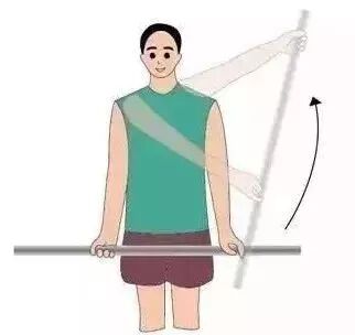 招式一:双手持一根木棍,患病的上臂,与身体贴紧,用健康的手掌通过木棍推患病一侧的手掌,使患病一侧的手带动前臂外展。(达到极限后,坚持6秒,注意做这个动作时上臂要贴近胸廓)