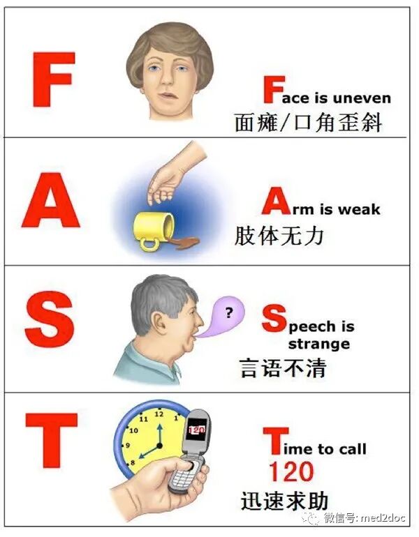 专家提醒民众,若遇到中风的紧急预警要记住「FAST」口诀,F代表面部下垂,A代表手臂无力,S代表说话困难,T代表及时拨打求救电话。