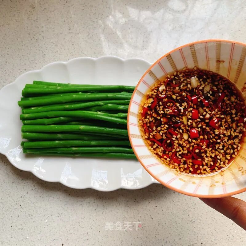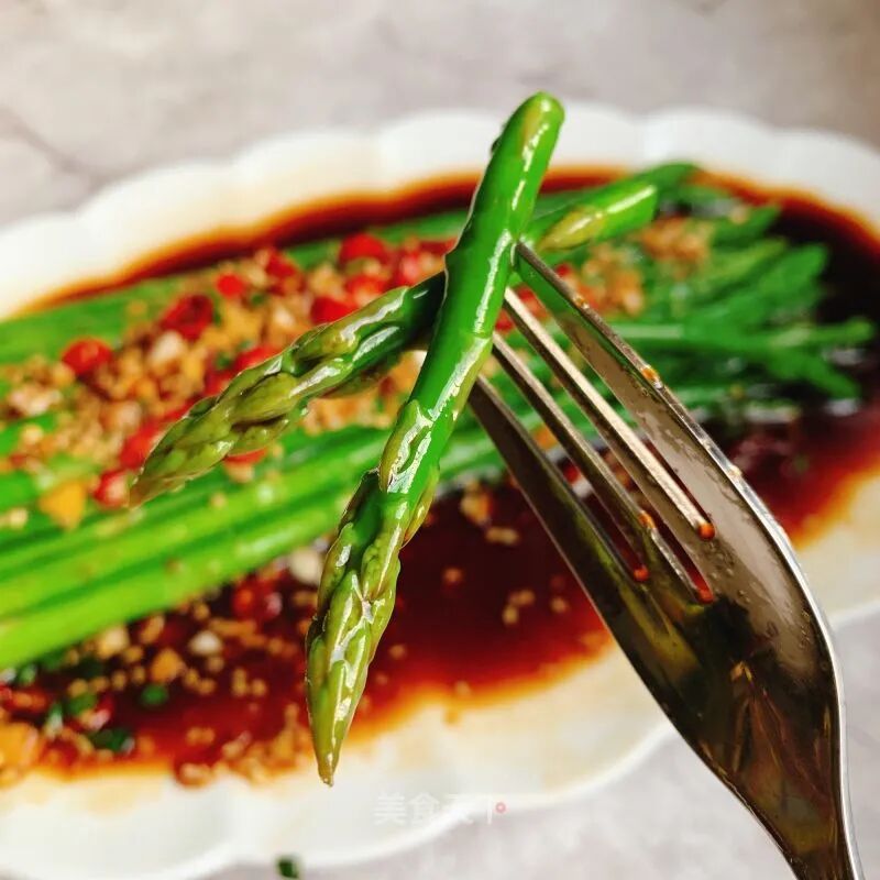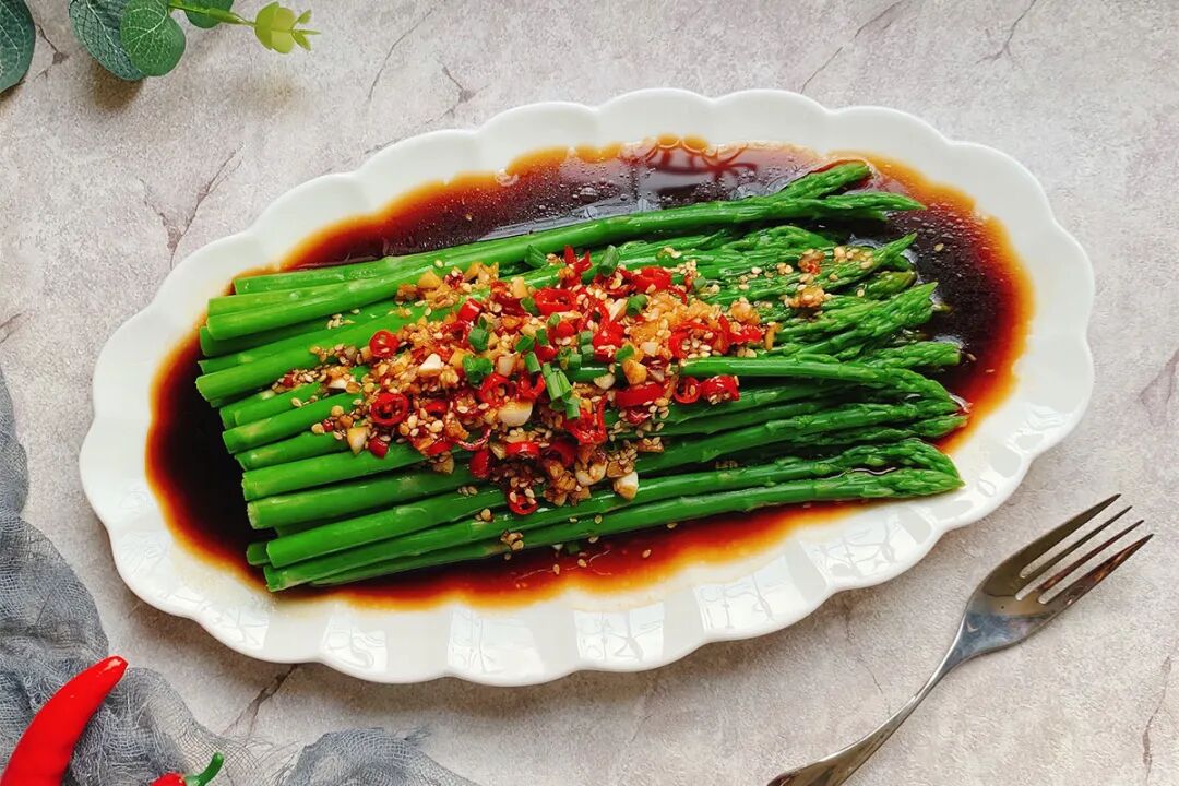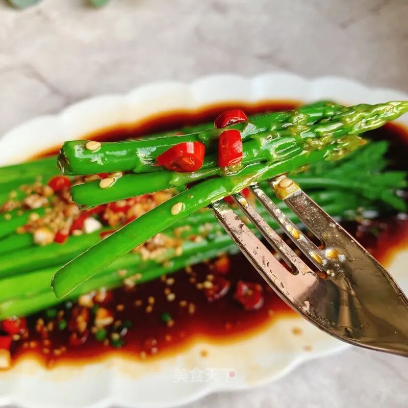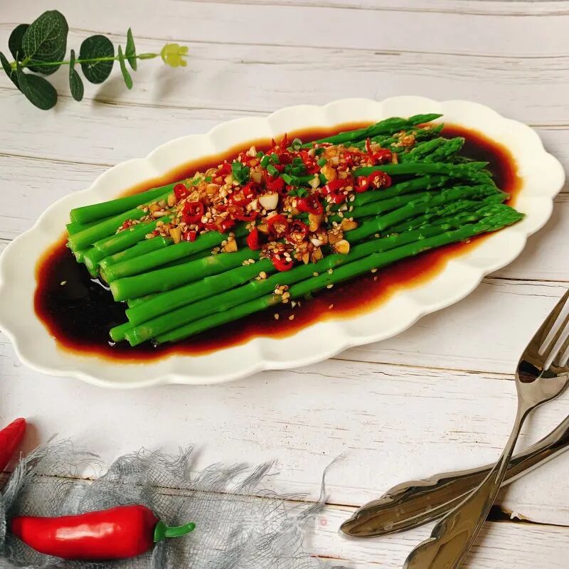 芦笋1把大蒜适量小米椒适量油少许盐少许生抽1-2勺醋1勺蚝油1勺糖2-3g凉白开2勺