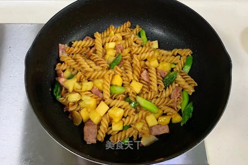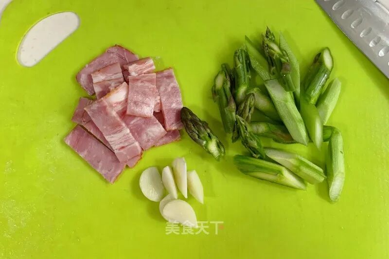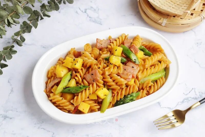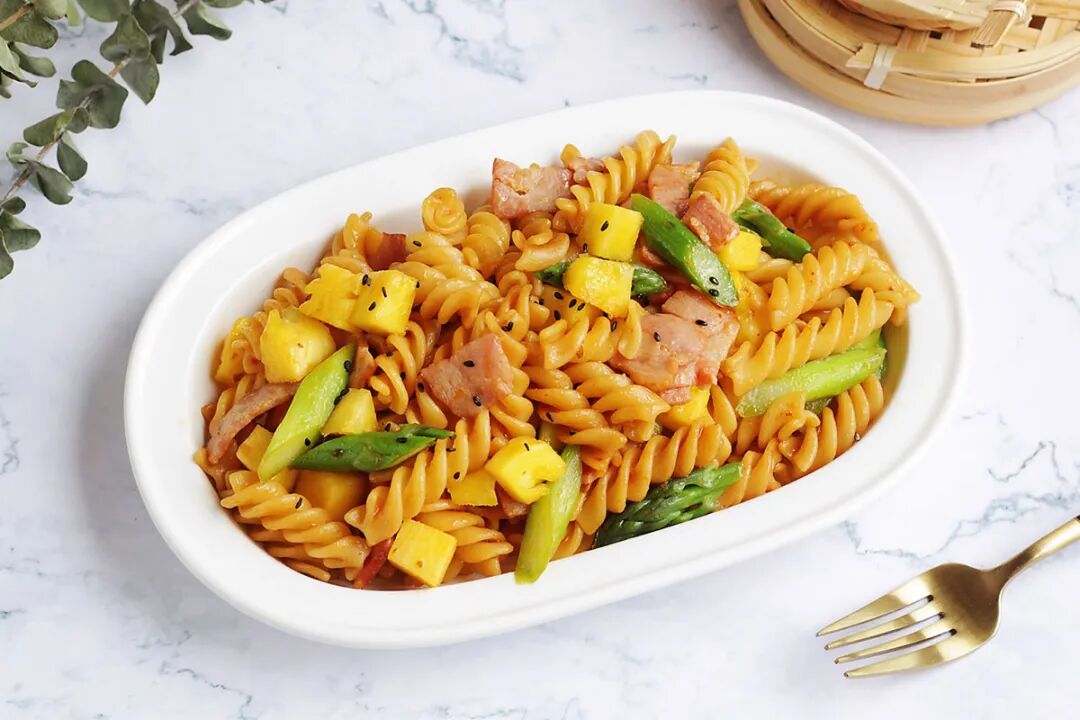 意大利面100g芦笋2根菠萝80克培根2片蒜1个生抽1勺蚝油1/2勺辣味黄豆酱1勺盐1小匙橄榄油3勺
