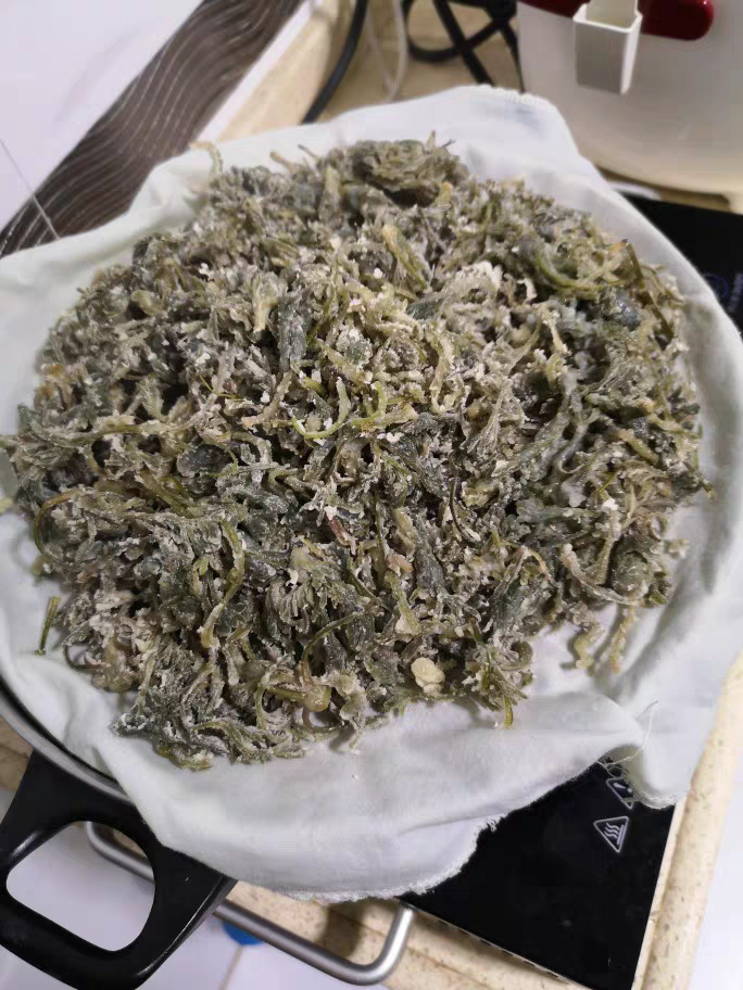 2.这时,把洗过的苦艾放在容器里,撒上一把面粉,搅拌均匀,用一层面粉包起来。