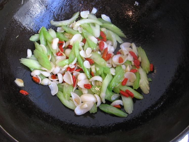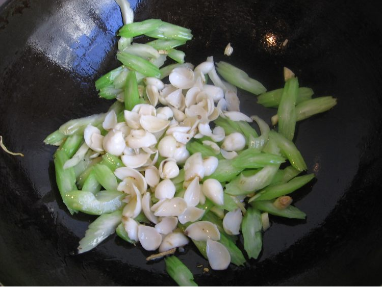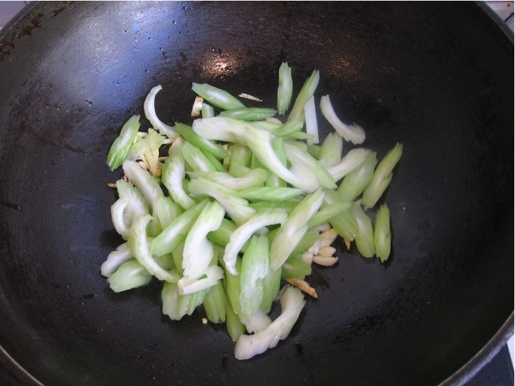 5、加入西芹快速翻炒一分钟。
