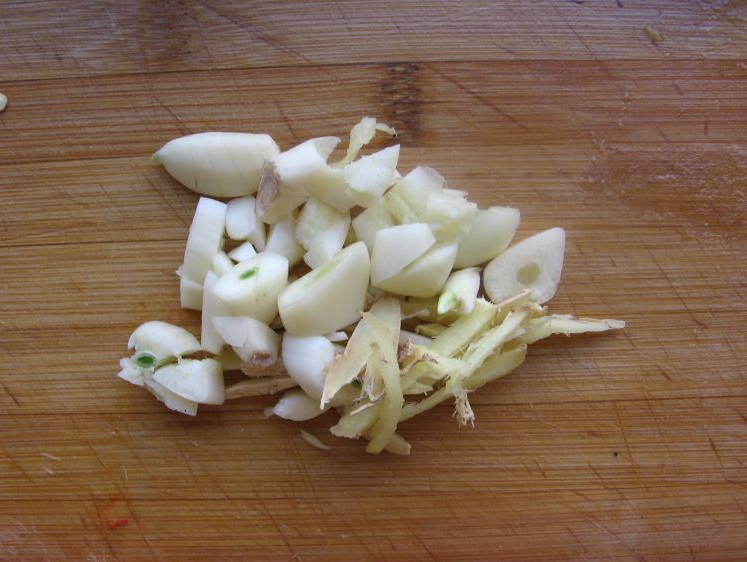 3、蒜压碎切粒,姜切丝。