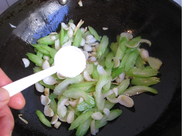 7、加盐和糖调味,下焯烫好的西芹,翻炒均匀即可出锅。