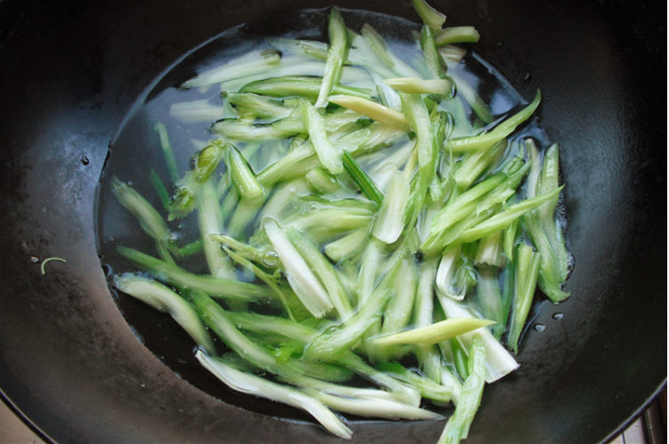 4、烧锅开水,加点盐,并滴几滴油,下西芹焯烫两分钟。