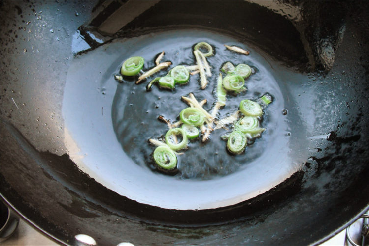 4、放入姜丝爆香,再加葱花。