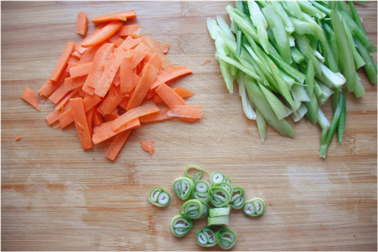 1、胡萝卜切片,芹菜斜着切片,葱切碎。