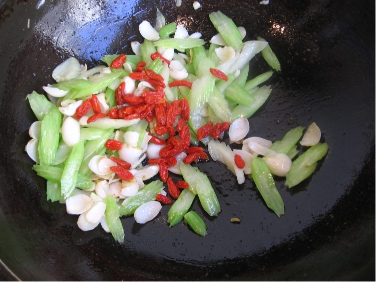 6、至西芹颜色变亮,加入百合。