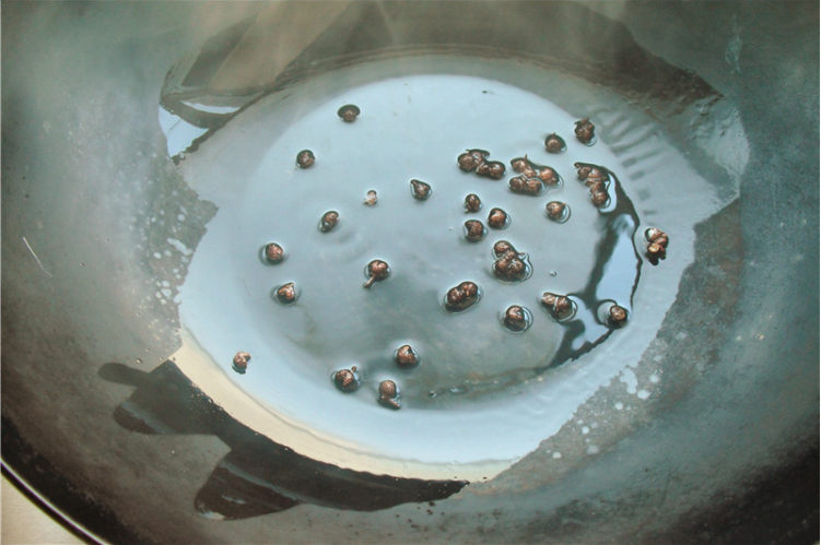 3、锅内加油,放入花椒爆香,捞出丢掉。