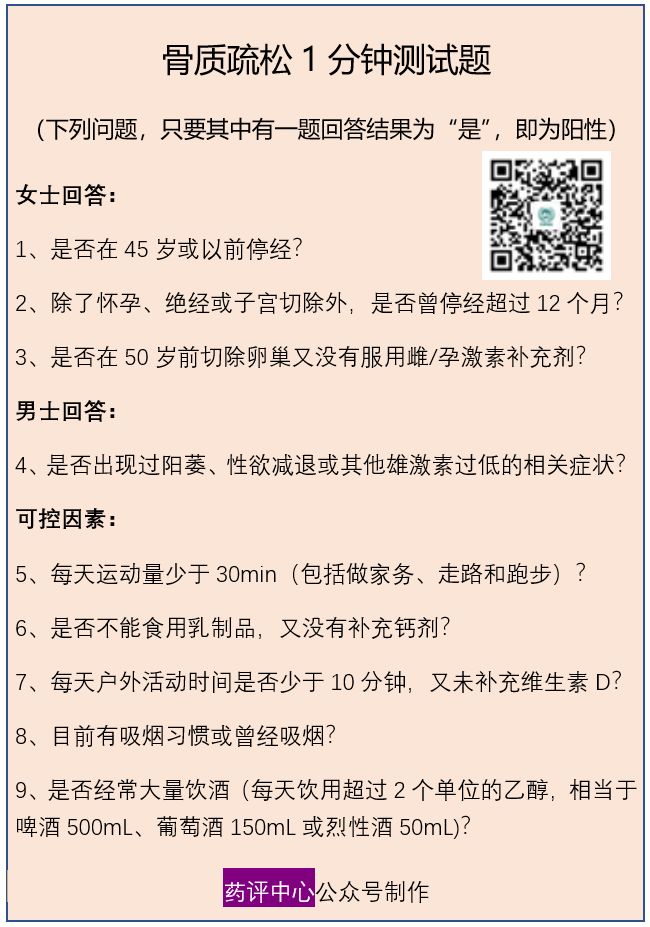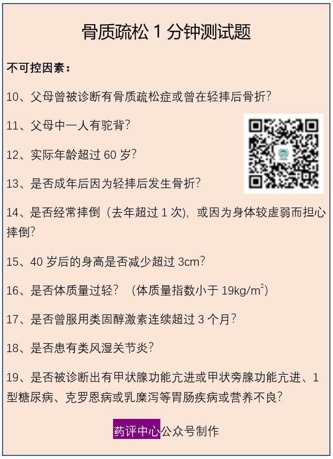骨质疏松风险1分钟测试题是根据患者简单病史,从中选择与骨质疏松相关的问题,由患者判断是与否,从而初步筛选出可能具有骨质疏松风险的患者。该测试题简单快速,易于操作,但仅能作为初步筛查疾病风险,不能用于骨质疏松症的诊断。