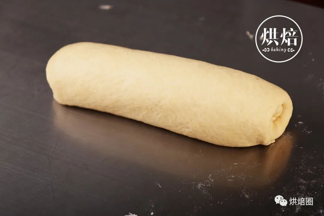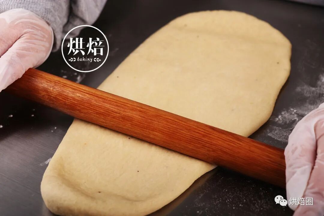 ⑥将松弛醒发好的面团排气压平,均匀擀成长方形状,底部压薄,自上向下卷成橄榄形状。