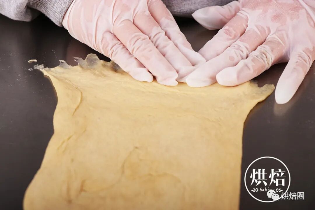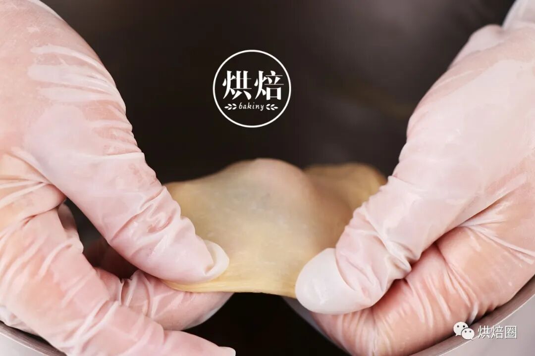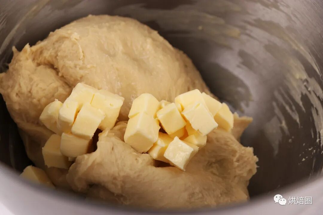 ②加入软化的无盐黄油,继续搅打至面团呈光滑,可拉出均匀的薄膜状即可。