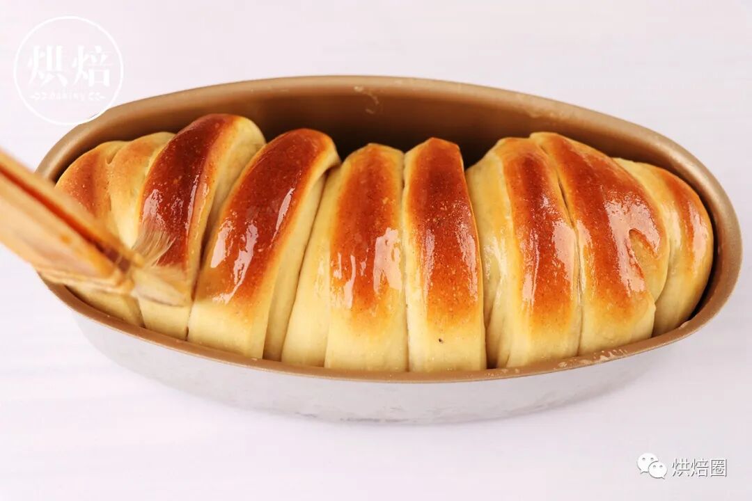 ⑩出炉后轻震模具,再在面包的表面刷上一层薄薄的黄油,就可以脱模放凉了。(出炉立即轻震,便于吐司脱模)
