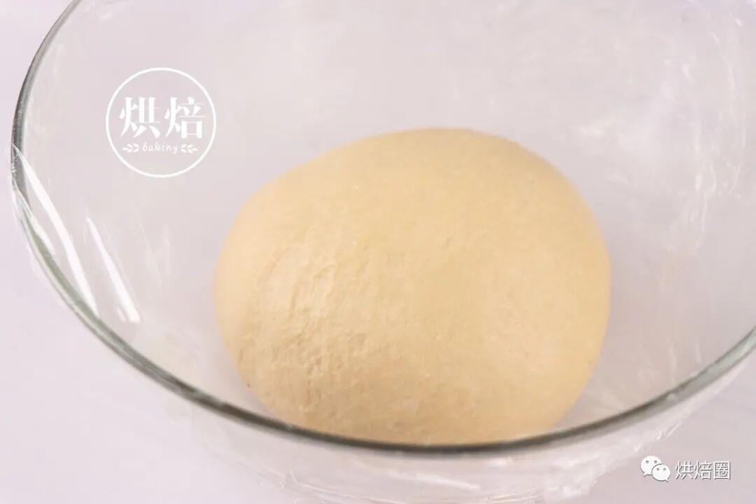 ③取出面团,整形成一个表面光滑的面团,放入盆中,盖上保鲜膜发酵松弛60分钟。