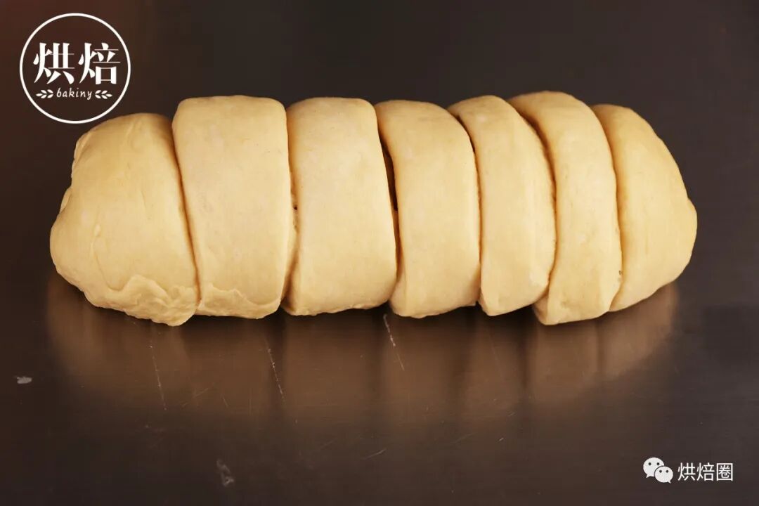 ⑦卷好的面团,先从中间切开,再把整个面团切成一段段的,过程中保持整体造型不变。(切好的面团一定要贴合按紧,不然容易发酵过大不好看)