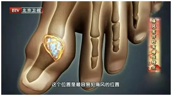 当血液中尿酸含量的不断增加,就容易形成尿酸钠针状结晶体,并结沉积在关节及其周围组织中,比如:膝关节、脚踝、脚趾等处,但以第一跖趾最常见。