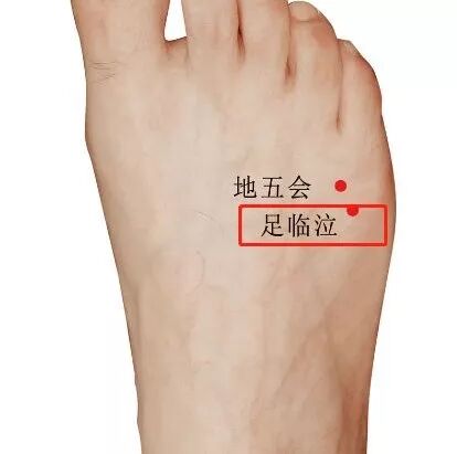 足临泣穴就在第四脚趾和小脚趾之间缝的终点,取穴方法是将手指从四脚趾和小脚趾之间的缝向脚背方向推,推到有骨头的边缘时就是足临泣穴。