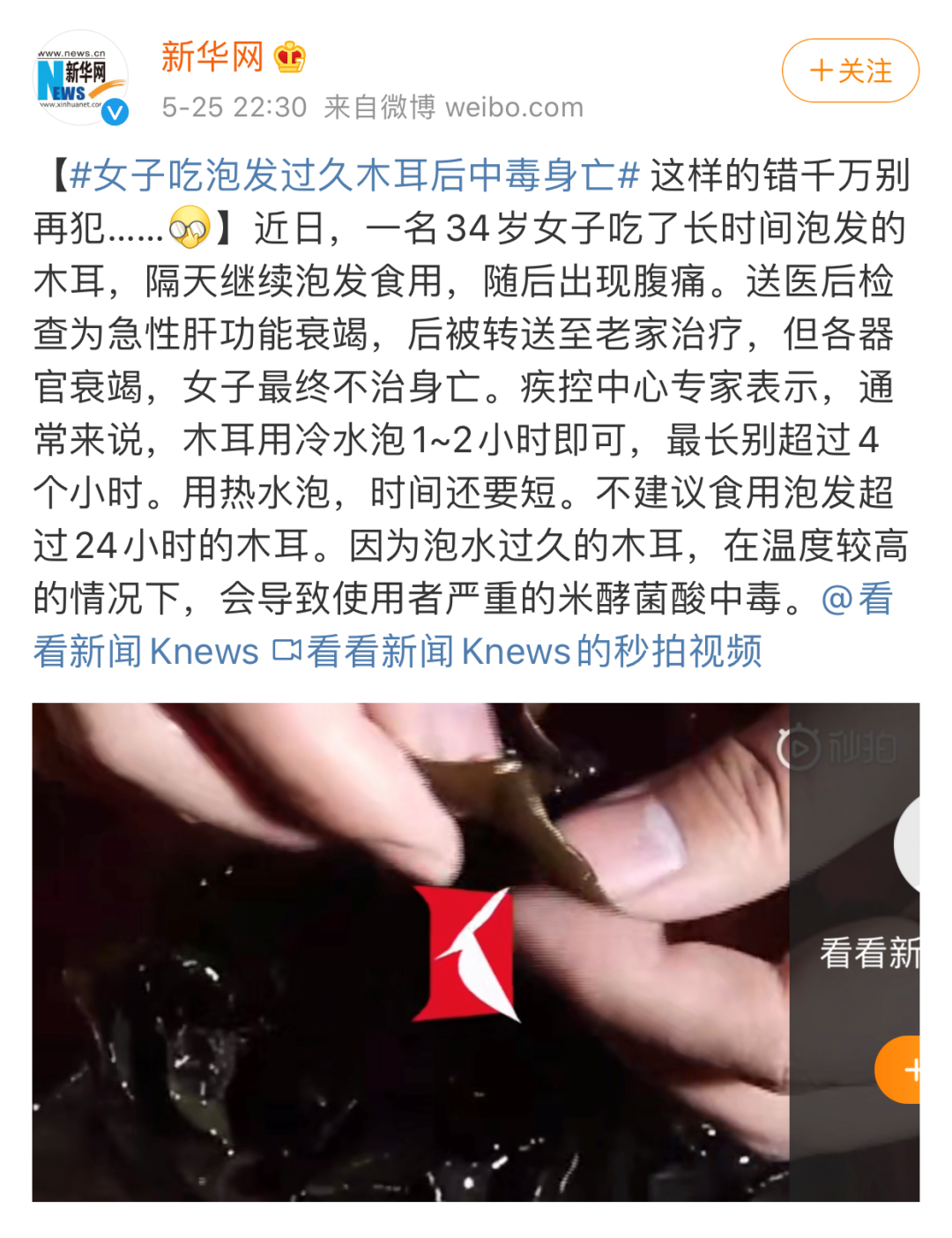 5月25日,新华网发布了这样一条新闻“女子吃泡发过久木耳后中毒身亡”。