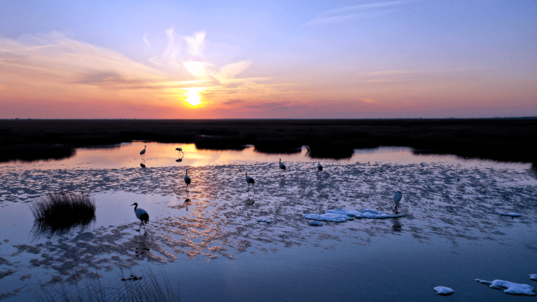 ▲越来越多的珍稀野生动物在黄河口湿地栖息(摄影:东营广播电视台杨斌)