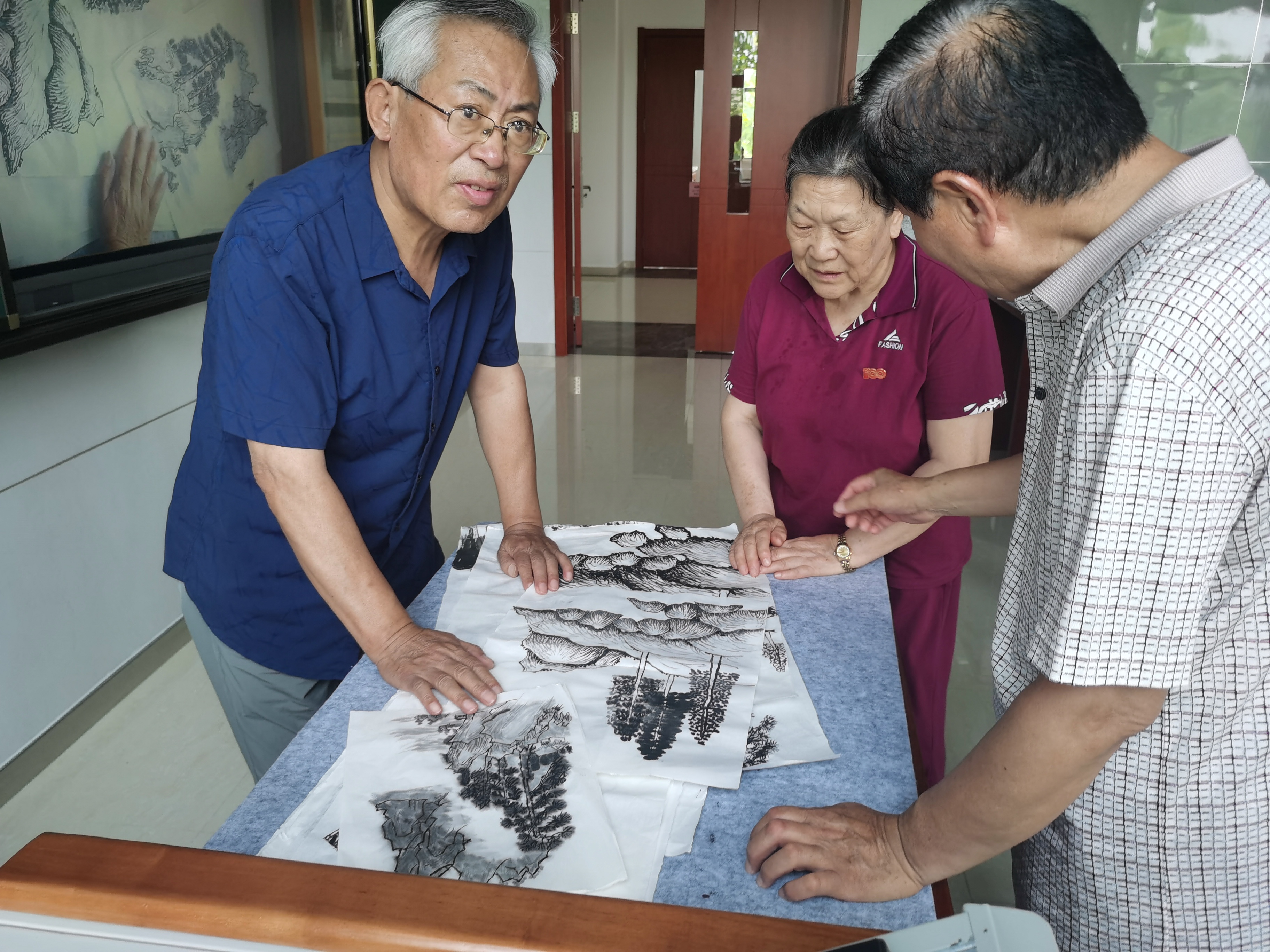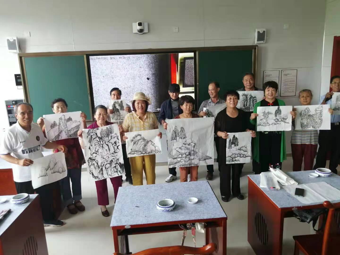 全班同学展示书画作品,相互交流书画作品,参观健康查体中心
