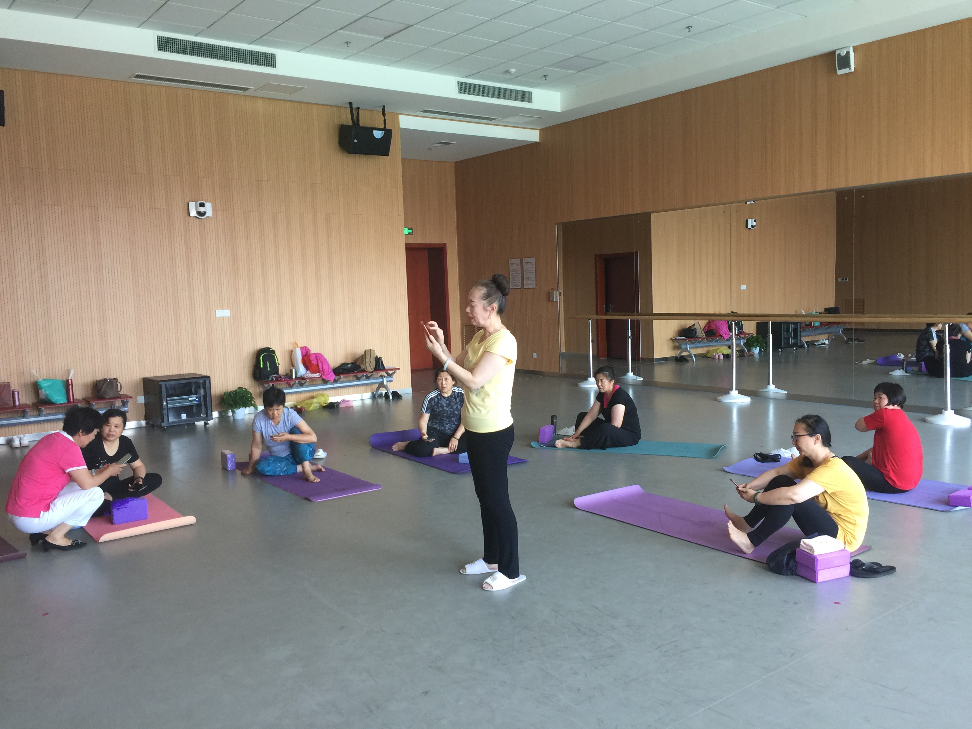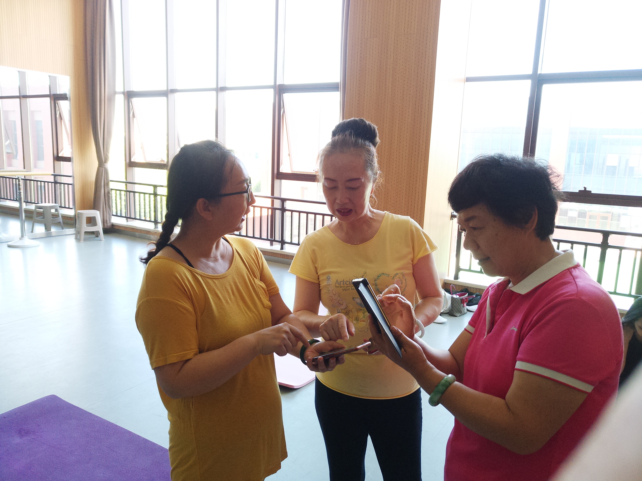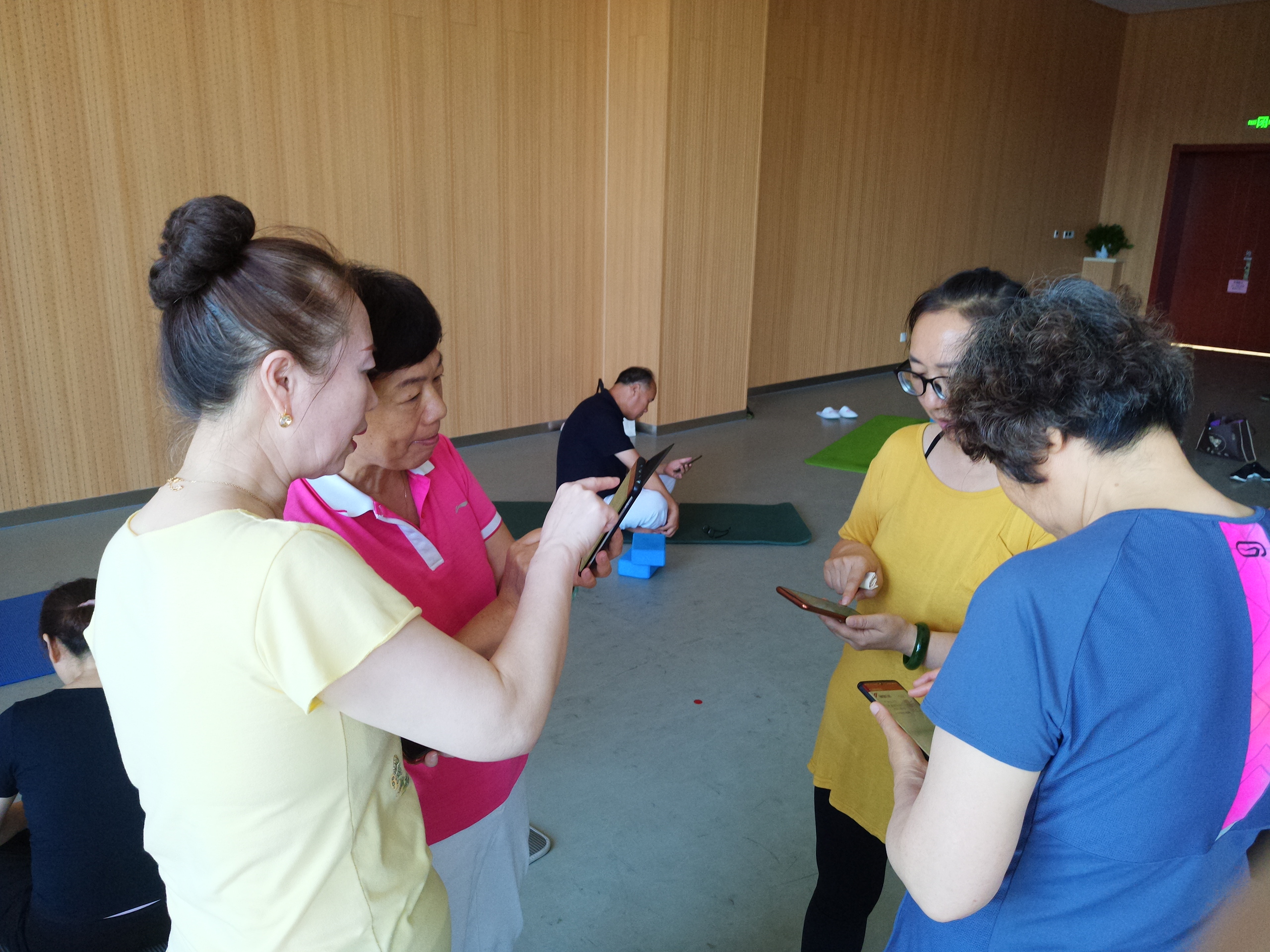 瑜伽五班利用课前的时间为同学们讲解如何在老年大学的APP上请假、报名和查看自己的积分。