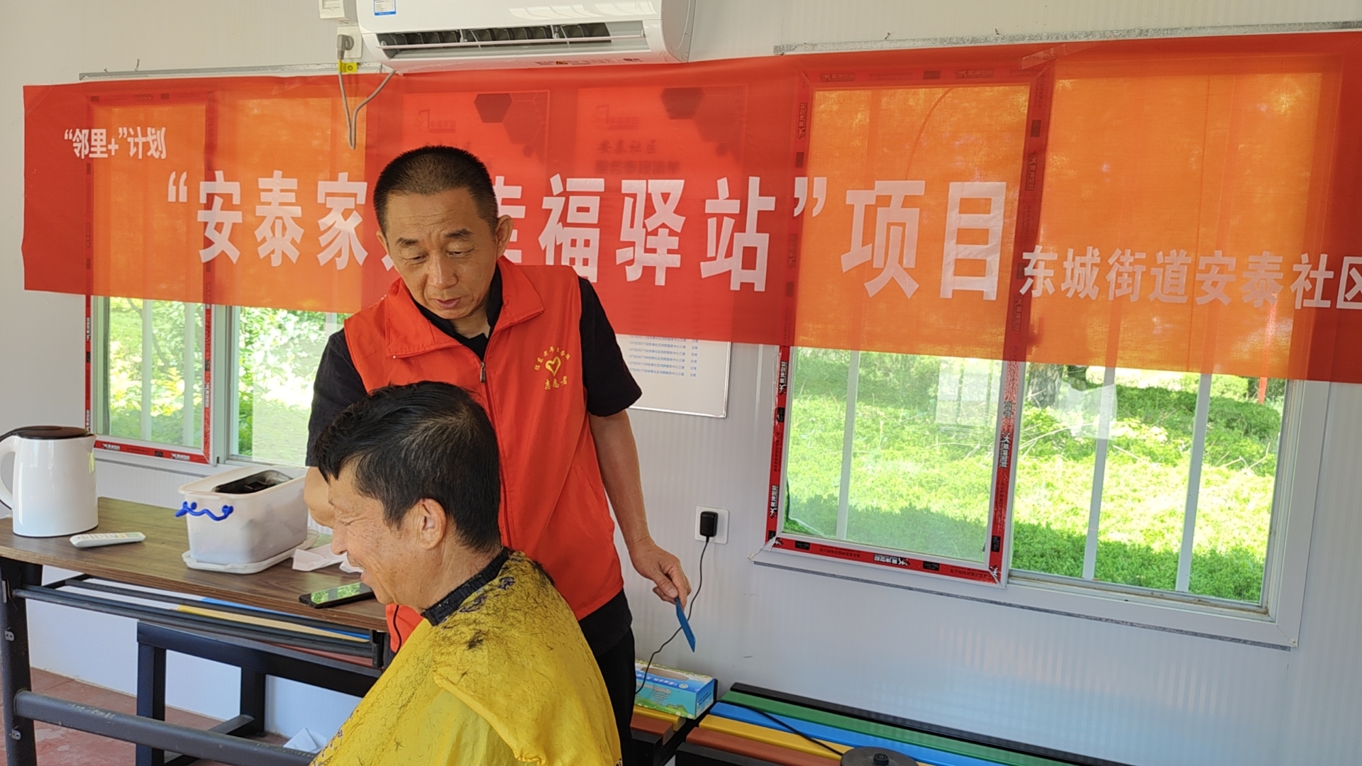 6月1日上午8:20—10:20,安泰社区“家里人”志愿者在安泰社区开展“暖心益剪”为老人理发活动 活动现场,“家里人”志愿者们早早来到幸福驿站,把凳子和理发工具摆好,等候着居民的到来。理发师根据居民们需求,细心为修剪头发,在理发师的仔细打理下,居民变得神采奕奕。经过精心修剪,居民的头发逐渐变得整齐利落,整个人也变得精神了许多。 爱心义剪活动虽然看起来微不足道,却充满着浓浓的温情。“理得真不错。谢谢你们了,我年纪大了,行动不方便,你们能来帮助我,真是帮了我大忙了。”理发后,居民刘大妈看着镜子里的自己,连连表达感谢。