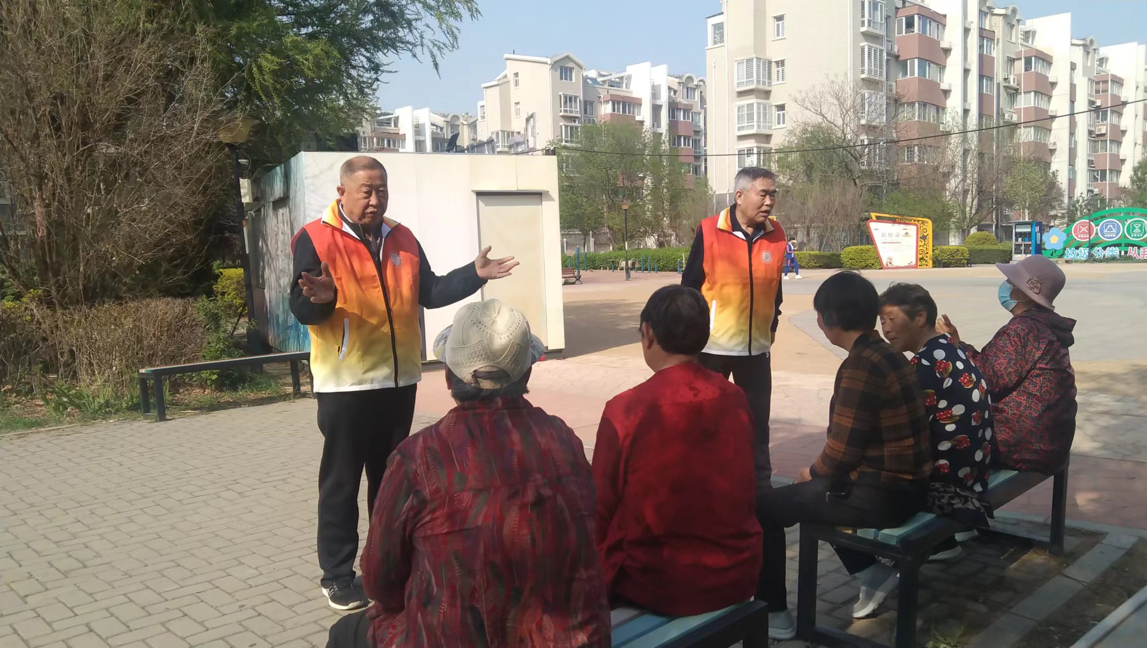 安泰社区“金秋暖阳时间银行”志愿队志愿者董兆林、王泽友、王方贵在做好“固定老干部”服务的同时,4月17日下午15:00-17:00到安泰北区广场,走进老年人聚集的地方,开展倡导文明宣传活动。 活动中,志愿者们在安泰北区中心广场,以聊天的形式,就社区领导,对关心老年人生活幸福感和活动场所修缮,就小区还有哪些不足,需要改进,并征求大家的建议和意见。同时鼓励居民自觉维护环境卫生、遵守公共秩序、爱护公共设施、注重文明礼仪、争做践行文明的模范,用自己的行动影响和带动身边的人。 通过此次宣传,在社区形成了“人人争当文明卫生劝导员”的浓厚氛围,居民纷纷表示,愿意争当文明卫生劝导员,相互提醒,相互监督,革除不良陋习,养成文明习惯,共建和谐家园。