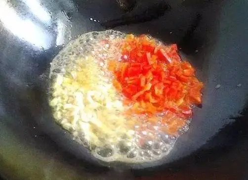 2.热锅倒入适量豆油,豆油烧至七成熟,加入红辣椒粒和蒜粒炒出香味